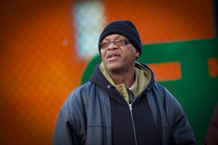 Man in blue wool cap stands in front of chain link fence on Park Street