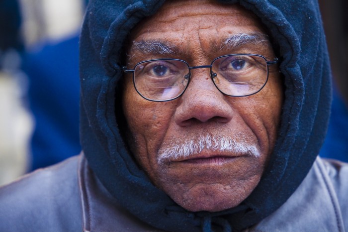 Older man in blue hoodie