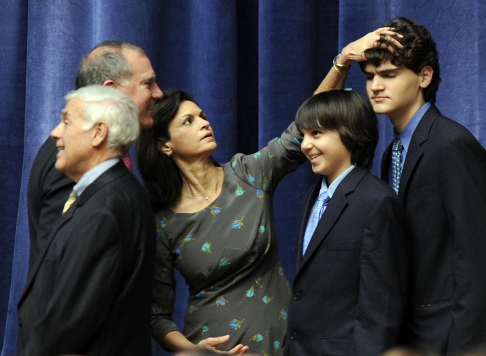 Diana Sousa, center, wife of Connecticut Attorney General-elect George Jepson, left, fixes the hair of their sons Christian and William prior to Jepson taking the stage to be sworn-in to office during the inauguration ceremony for Gov. Dannel P. Malloy as Governor of the state of Connecticut Wednesday, January 5, 2010 at the William A. O'Neill Armory in Hartford. (Sean D. Elliot/The Day)