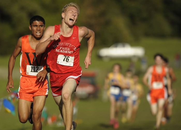 Norwich Free Academy's Andrew Weiler races past Watertown's Mo Shaw (112) at the finish of the Boys Varsity Championship race at the Wickham Invitational high school cross country meet Saturday, October 8, 2011 at Wickham Park in Manchester. (Sean D. Elliot/The Day)