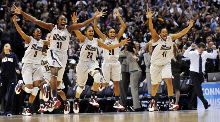 UConn players, from left, Tiffany Hayes (3), Tina Charles (31), Maya Moore (23), Renee Montgomery and Kaili McLaren (41), along with head coach Geno Auriemma, right, celebrate their NCAA national championship game win over Louisville Tues. April 7, 2009 at the Scottrade Center in St. Louis. The Huskies' 76-54 win gave the program their sixth national title and third undefeated season. (Sean D. Elliot/The Day)